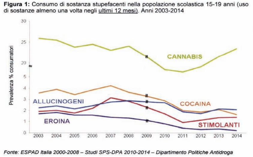 Per quanto riguarda il consumo di droghe da parte dei giovani in età scolastica, la cocaina, gli stimolanti (di cui fa parte l’ecstasy) e l’eroina hanno subìto complessivamente un calo negli ultimi 15 anni, anche se negli ultimi anni il consumo di stimolanti è leggermente aumentato. È aumentato invece molto il consumo di cannabis a partire dal 2011, anche se il consumo di questa sostanza è sempre stato molto maggiore delle altre nell’elenco ed è largamente considerato poco pericoloso dalla gran parte della letteratura scientifica (l’alcol è molto più pericoloso, per esempio).