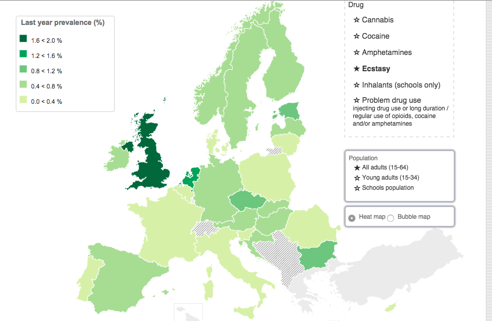 Nello specifico, l’ecstasy in Italia ha un prezzo abbastanza alto (circa 17 euro per pasticca) ma è abbastanza pura (cioè non viene mischiata con molte altre sostanze prima di essere venduta) rispetto a quella venduta negli altri paesi europei. Se volete approfondire prezzo, purezza e incidenza sulla popolazione di altri tipi di droghe potete guardare qui per l’Italia o qui per gli altri paesi europei.