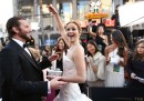 Jennifer Lawrence è nata a Louisville, in Kentucky, il 15 agosto 1990: oggi compie venticinque anni, e da qualche tempo è causa di esteso sconforto tra molti suoi coetanei, che non si capacitano – comprensibilmente – della quantità di cose che è riuscita a fare in così poco tempo. Da quando ne sentiamo parlare, e cioè da più o meno cinque anni, Lawrence ha messo insieme tre nomination agli Oscar (e ne ha vinto uno come migliore attrice protagonista, diventando la seconda più giovane di sempre), ha vinto due Golden Globe (e ha ricevuto un’altra nomination), è stata protagonista di una saga di enorme successo commerciale (Hunger Games) e coprotagonista di un’altra (X-Men) e ha raccolto tantissimi apprezzamenti dalla critica. A venticinque anni, insomma, ha già fatto cose che renderebbero rispettabilissima un’intera carriera: e chissà che cos’altro farà, nei prossimi venticinque.