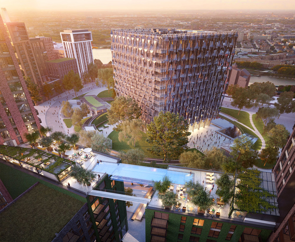 La piscina, che farà da ponte tra i due edifici, è stata progettata dallo studio di architetti Arup Associates, mentre il piano per lo sviluppo degli altri edifici e servizi intorno alla grande vasca sono di Ballymore Group. Il progetto prevede, tra le altre cose, la realizzazione di un bar e di una spa agli ultimi piani dei due palazzi.
