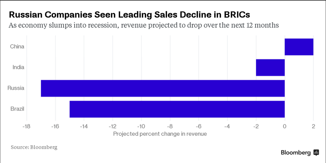 Secondo le proiezioni degli analisti, fra i cosiddetti paesi BRIC (Brasile, Russia, India, Cina), le principali economie emergenti, la Russia è quella da cui aspettarsi il maggiore calo di vendite per le aziende.
