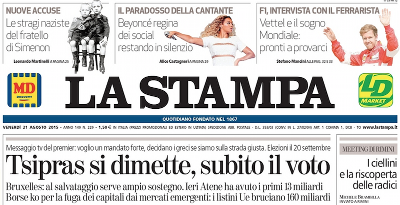 La notizia con cui oggi aprono tutti i principali giornali italiani è quella delle dimissioni del primo ministro Alexis Tsipras e delle nuove elezioni in Grecia, che si terranno il 20 settembre. La decisione di Tsipras di andare a elezioni anticipate si deve alla divisione interna del suo partito, SYRIZA, una cui parte ha sempre duramente criticato il nuovo accordo raggiunto tra la Grecia e i creditori e non lo ha sostenuto in parlamento costringendo il governo a fare affidamento sui voti dell’opposizione. Un’altra notizia molto presente sui giornali di oggi è quella dei funerali di Vittorio Casamonica, membro di una famiglia nota a Roma per essere stata coinvolta in diversi casi di criminalità organizzata: c’era una carrozza trainata da 6 cavalli neri, un elicottero che lanciava petali di rosa e una banda che suonava canzoni dal film “Il Padrino”. Tra le altre notizie presenti oggi sulle prime pagine, il Corriere della Sera si occupa dell’organizzazione del Giubileo a Roma, Libero racconta di Renzi e dei problemi della riforma della scuola, mentre l’Unità ricorda ancora in prima pagina Khaled al Asaad, l’archeologo siriano ucciso a Palmira dall’ISIS.