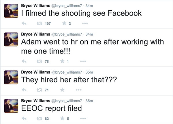 Durante la fuga, Flanagan ha usato i suoi account Twitter e Facebook registrati come Bryce Williams – il nome che aveva scelto per la sua carriera da giornalista – per pubblicare un video girato da lui stesso durante l’assalto. Nella ripresa erano visibili i due giornalisti mentre lavoravano in diretta alla loro intervista, l’avvicinamento di Flanagan e l’esplosione dei primi colpi dell’assalto, con la pistola in primo piano. Il video è rimasto online per qualche minuto sia su Twitter sia su Facebook, prima che i due social network lo rimuovessero sospendendo gli account utilizzati. Oltre a pubblicare il video, Flanagan ha scritto anche alcuni tweet dove accusava Parker di avere “fatto commenti razzisti” nei suoi confronti, e segnalando che Ward era “andato dalle risorse umane per lamentarsi di me dopo avere lavorato appena una volta insieme!!!”.