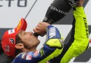 Il 36enne noto pilota italiano Valentino Rossi ha vinto il Gran Premio del Regno Unito, che si è tenuto oggi nel circuito di Silverstone. È la quarta vittoria in stagione per Rossi su 12 gare. Grazie alla vittoria di oggi Rossi – che in stagione non è mai sceso sotto il terzo posto – è anche tornato al primo posto della classifica piloti, superando il suo compagno di scuderia alla Yahama Jorge Lorenzo: oggi, a sei gare dalla fine, Rossi ha 236 punti mentre Lorenzo – che nel Regno Unito è arrivato quarto – ne ha 224. Sul podio, oggi, sono arrivati anche altri due piloti italiani: Danilo Petrucci e Andrea Dovizioso della Ducati sono arrivati rispettivamente secondo e terzo. L’ultima volta che tre italiani erano andati sul podio era accaduta nel primo Gran Premio della stagione, quello del Qatar: allora vinse ancora Rossi, secondo arrivò Dovizioso e terzo finì Andrea Iannone.