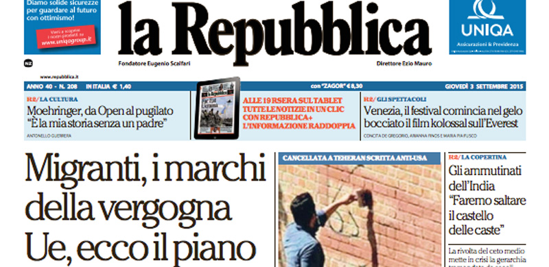 Per la maggior parte dei giornali l’apertura è dedicata sempre alle notizie legate all’arrivo dei migranti in Europa, con la foto del bambino annegato in Turchia, la decisione della Repubblica Ceca di “marchiare” a pennarello con un numero sulla mano i migranti giunti nel paese, e la richiesta congiunta di Italia, Germania e Francia all’Unione Europea di rivedere le norme sull’asilo. L’altra notizia, in apertura sul Corriere della Sera, il Fatto e il Mattino, sono i primi provvedimenti di assunzione degli insegnanti previsti nella riforma della scuola del governo.