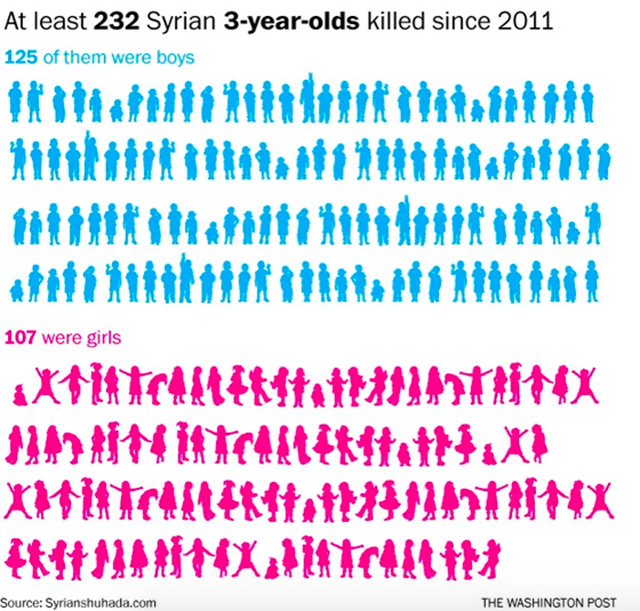Altre sofferenze riguardano i bambini di età diverse. In totale, all’archivio risulta prova di almeno duemila bambini di meno di dieci anni uccisi dall’inizio dei combattimenti. Le stime di altri gruppi sono anche peggiori: l’Osservatorio Siriano per i Diritti Civili, un gruppo con sede in Gran Bretagna, ha detto che almeno 11.493 bambini sono stati uccisi finora nella guerra. Sono stime che non tengono conto di bambini come Alan Kurdi, morti mentre fuggivano dalla Siria.