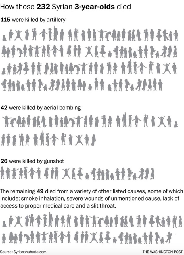 Un’organizzazione che registra le morti nella guerra, l’Archivio Siriano dei Martiri della Rivoluzione, ha dati dettagliati sulla morte di almeno 232 bambini di tre anni. Il numero reale potrebbe essere molto più alto: l’organizzazione, gestita da oppositori del regime siriano, spiega che in molti casi l’età dei bambini uccisi non è nota e non è quindi registrata. In altri casi non è stata registrata neanche la stessa morte.