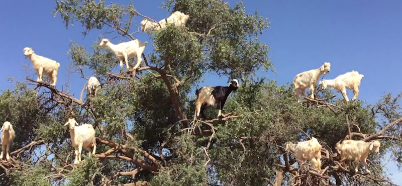 L’agenzia Photo Workshop Adventures ha diffuso un video girato in Marocco in cui alcune capre si arrampicano e stanno curiosamente ferme sopra a un albero. Il blog Atlas Obscura ha spiegato che il comportamento di queste capre è dato dal fatto che nel sudovest del Marocco è molto diffusa la Argania spinosa, una pianta il cui frutto è molto apprezzato dalle capre. Altri video simili sono già stati pubblicati su YouTube nel tempo.