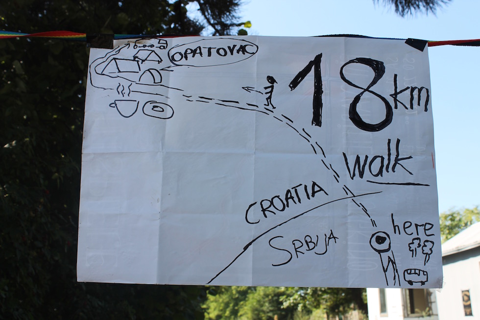 A pochi metri di distanza c’è il confine vero e proprio, segnalato solo da una vecchia sbarra arrugginita e da un cartello con la scritta in inglese – forse messo da alcuni attivisti o volontari nei giorni scorsi – che indica la distanza che separa il confine dal campo di Opatovac, in Croazia. Non ci sono autorità al confine: non c’è la polizia serba, che pattuglia la strada ai piedi della collina ma non ferma i pullman o i taxi dei migranti. E non c’è nemmeno la polizia croata, che si trova a circa 200 metri dal confine in territorio croato.