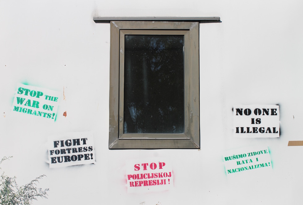 Alcuni messaggi sulla parete di un piccolo edificio qualche metro prima del confine tra Šid, in Serbia, e Bapska, in Croazia. I messaggi dicono per esempio “Stop alla guerra ai migranti”, oppure “Nessuno è illegale”. (Il Post)