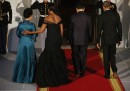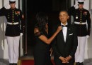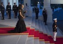 Venerdì 25 settembre, per la cena di stato alla Casa Bianca in onore della Cina, la first lady Michelle Obama ha scelto di indossare un abito di Vera Wang, stilista americana di origini cinesi, molto conosciuta anche per i suoi abiti da sposa: sciogliendo una questione che a suo tempo aveva generato qualche discussione tra gli addetti ai lavori della moda. Per una simile visita di stato cinese alla Casa Bianca, infatti, quattro anni fa, Michelle Obama aveva messo un vestito dello stilista britannico Alexander McQueen, irritando gli stilisti americani, che non si erano sentiti rappresentati in un’occasione del genere. In molti aspettavano quindi di vedere se Michelle Obama avrebbe colto l’occasione per rimediare all’incidente diplomatico interno. Pochi giorni fa Robin Givhan aveva ricostruito la vicenda sul Washington Post e dato dei suggerimenti alla first lady tra cui quello della stessa Vera Wang.