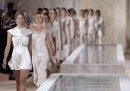 La scenografia del suo show era ecclesiastica nell’estetica e nelle tonalità, con quattro piscine lunghe e strette che formavano una croce e tagliavano il grande ingresso dello storico Centre Laennec, fondato nel 1800 da studenti di medicina e gesuiti. Con il suo soffitto altissimo e i suoi archi sontuosi, l’edificio richiamava l’atmosfera che accompagnò una presentazione del fondatore della casa, Cristobal Balenciaga.