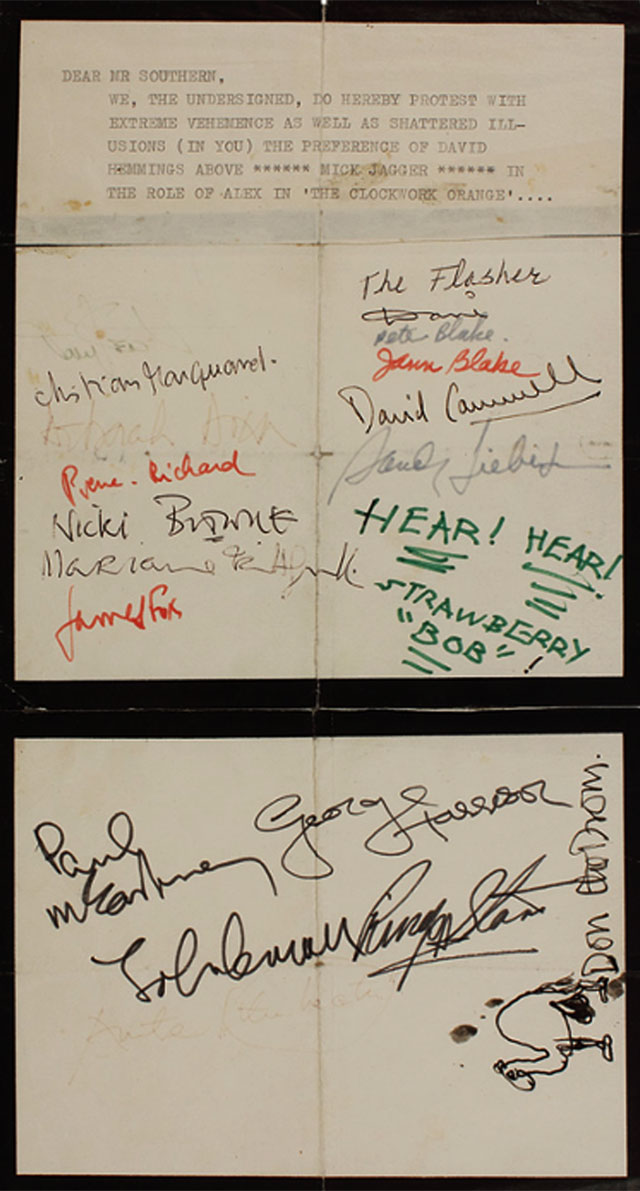 La petizione, firmata anche dai Beatles, che Paddle8 ha messo all’asta risale a poco prima che McDowell venisse scelto come attore protagonista ed è indirizzata a Southern, che aveva appena scartato Jagger preferendogli l’attore britannico David Hemmings, che nel 1966 aveva recitato in Blow Up di Michelangelo Antonioni. I firmatari della petizione protestavano «con estrema veemenza e distrutta illusione» per la scelta di Hemmings al posto di Jagger: fu probabilmente scartato perché Kubrick e Southern erano preoccupati dal suo «stile di vita decadente».