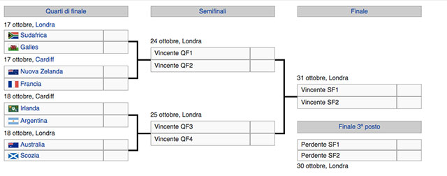 Ai quarti di finale della Coppa del Mondo si sono qualificate quattro squadre dell’emisfero sud e quattro dell’emisfero nord. Le squadre dell’emisfero nord sono tutte le squadre del Sei Nazioni – la competizione annuale tra le migliori nazionali europee – a eccezione di Italia e Inghilterra, che sono state eliminate. Le quattro squadre dell’emisfero sud sono quelle che da alcuni anni si giocano il Rugby Championship, il corrispettivo del Sei Nazioni per l’emisfero meridionale. Non ci sono quindi grandi sorprese: sarebbe stata sorprendente una qualificazione del Giappone – che non ce l’ha fatto per un pelo nel girone di Sudafrica e Scozia – ed è una grande sorpresa la non-qualificazione dell’Inghilterra, che ha perso contro Australia e Galles ed è stata eliminata dai Mondiali di casa: non era mai successo che l’Inghilterra non arrivasse almeno ai quarti di finale di una Coppa del Mondo di rugby.