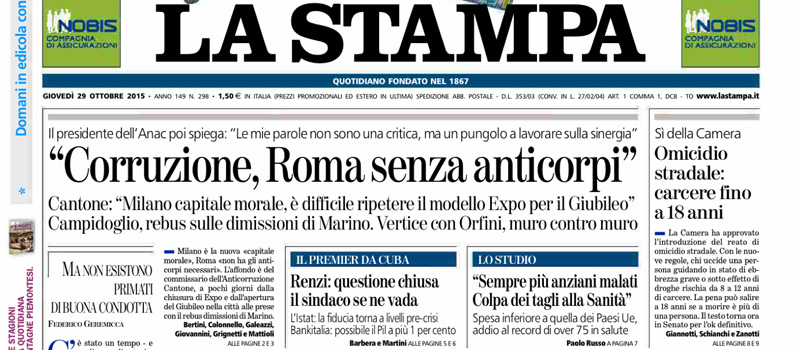 Per i giornali principali in edicola oggi l’apertura è dedicata alle parole del presidente dell’Autorità anticorruzione Raffaele Cantone, che tracciando un bilancio dell’Expo ha definito Milano capitale morale, criticando invece Roma che non avrebbe gli anticorpi alla corruzione. Il Manifesto titola invece sulla scarcerazione del marocchino accusato per l’attentato al museo del Bardo di Tunisi, il Giornale e Libero criticano la RAI per il compenso speso per ospitare Varoufakis a Che tempo che fa, mentre i quotidiani sportivi titolano sulle vittorie di Roma e Napoli e sulla sconfitta della Juventus nel turno infrasettimanale di campionato.