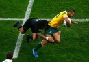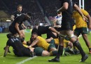 Nei primi venticinque minuti la partita tra Australia e Nuova Zelanda è stata molto equilibrata e al 26esimo minuto il punteggio era ancora sul 3 a 3. Nella seconda metà del primo tempo la Nuova Zelanda è riuscita a portarsi in vantaggio con due calci di punizione e, poco prima dell’intervallo, con una meta di Milner-Skudder e un calcio di trasformazione di Dan Carter, il mediano d’apertura neozelandese. Il primo tempo è finito 16 a 3 per la Nuova Zelanda.
