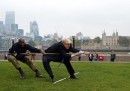 Un campo da calcio illuminato con i fari delle automobili e Boris Johnson in una gara di tiro alla fune, tra le migliori foto sportive della settimana