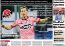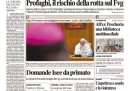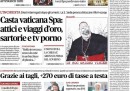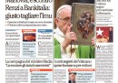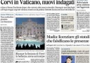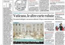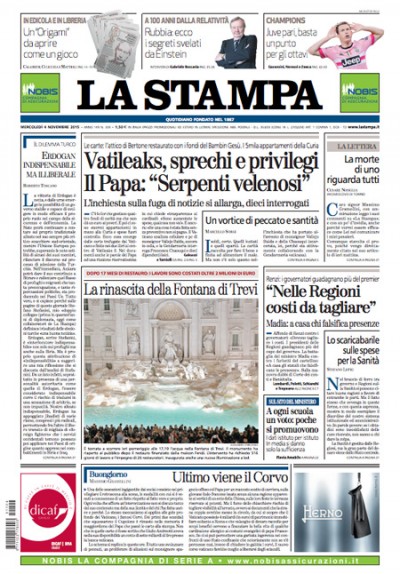 I quotidiani di oggi si occupano in apertura delle notizie dal Vaticano, entrando nel merito dei contenuti delle carte segrete che sono state rese pubbliche in due libri di prossima uscita e per le quali sono stati arrestati un vescovo e una consulente del Vaticano. Repubblica, il Manifesto, l’Unità e il Corriere della Sera titolano invece sulla legge di stabilità e sulle critiche ricevute da Banca d’Italia, Regioni e Corte dei Conti, mentre il Tempo apre sul processo per l’inchiesta su Mafia Capitale, che parte domani. I quotidiani sportivi hanno avuto tutti la stessa idea, giocando, nel titolo sul pareggio della Juventus in Champions League, sul cuore della Juve e su quello di Lichtsteiner, l’autore del gol del pareggio che è stato operato al cuore un mese fa.