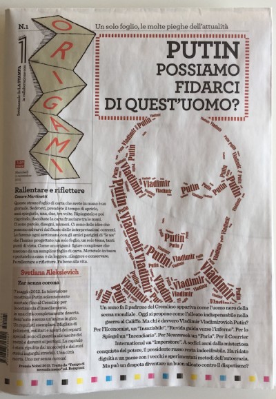 È in edicola da oggi Origami, una rivista realizzata dalla redazione del quotidiano La Stampa, che si acquista separatamente dal giornale e costa 1,50 euro. Origami è una rivista particolare, come formato: è un unico grande foglio piegato quattro volte. Ogni copia contiene articoli e informazioni su un solo argomento: quello del primo numero è Vladimir Putin e il ruolo ambiguo della Russia negli affari geopolitici dei nostri tempi. Origami è realizzata in collaborazione con Le 1, innovativa testata francese fondata da Eric Fottorino e Laurent Greilsamer, di cui riprende formato e grafica.