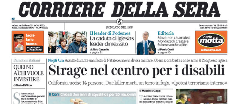 Le due notizie che si dividono l’apertura sui giornali di oggi sono l’attacco armato di tre uomini in un centro per disabili in California che ha provocato 14 morti e diversi feriti, e le accuse alla Turchia della Russia, che in una conferenza stampa tenuta a Mosca dai vertici militari ha mostrato immagini che proverebbero il coinvolgimento di Erdogan e della sua famiglia nel commercio di petrolio con l’ISIS.