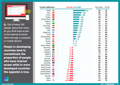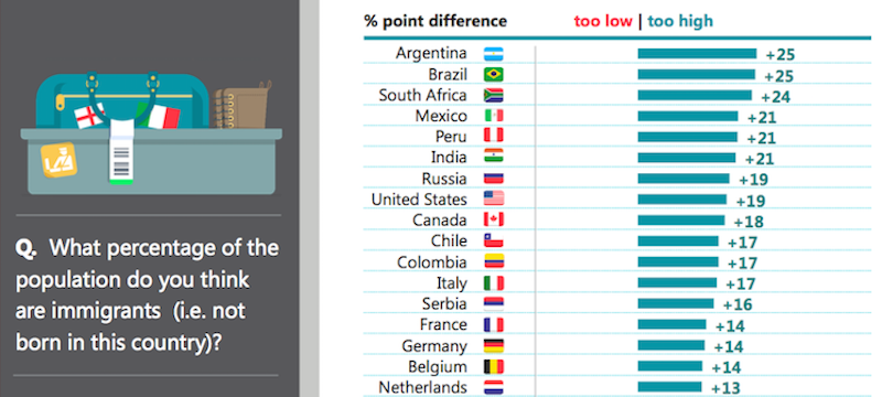 Ci sono alcuni temi su cui praticamente in tutto il mondo circola un’idea sbagliata: è il caso del numero di persone in sovrappeso o obese – sottostimato praticamente ovunque – oppure del numero di persone che si definiscono non affiliate a nessun credo religioso, dato sovrastimato in 31 dei 33 paesi in cui è stato condotto il sondaggio. Alcune percezioni esageratamente sballate circolano perlopiù in determinati paesi: in Giappone, per esempio, le persone contattate hanno detto di credere che più della metà degli viva in zone rurali, quando in realtà sono solo il 7 per cento. L’Italia compare quasi sempre nella parte alta della classifica, quella delle percezioni più imprecise: gli italiani contattati da Ipsos si sono sbagliati soprattutto sulla percentuale di immigrati presenti nel paese – pensavano fosse straniero quasi una persona su quattro: in realtà è meno di una su dieci – e sul numero complessivo di ragazzi che hanno meno di 14 anni.