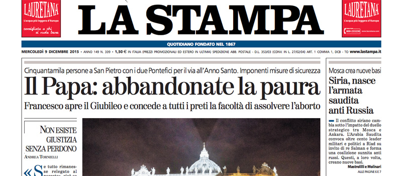 L’inizio del Giubileo straordinario della misericordia indetto da Papa Francesco con l’apertura della porta santa nella basilica di San Pietro è la notizia di apertura su quasi tutti i giornali di oggi. Fanno eccezione Repubblica e il Giornale che titolano sulle proposte del candidato alla presidenza degli Stati Uniti Donald Trump di chiudere gli Stati Uniti agli islamici e di limitare l’accesso a internet contro il terrorismo, e il Manifesto che si occupa di due nuovi naufragi di immigrati nell’Egeo e alle Canarie, mentre i quotidiani sportivi titolano sulla sconfitta in Champions League a Siviglia della Juventus, che si qualifica per gli ottavi di finale come seconda del suo girone.
