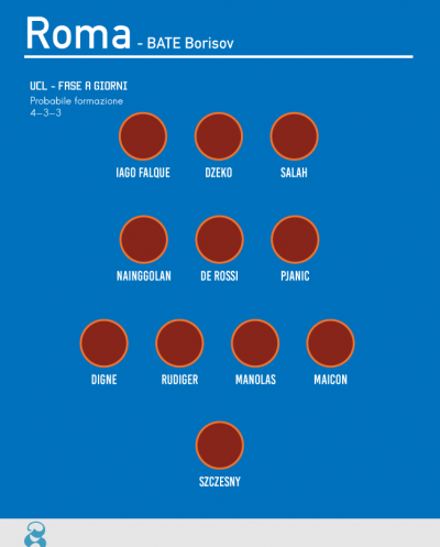 La Roma giocherà probabilmente con un 4-3-3; dovrà fare a meno del capitano Francesco Totti e di Gervinho, oltre a Kevin Strootman infortunato ormai da molti mesi. Il BATE invece non ha problemi di formazione: tutti i giocatori della rosa sono disponibili, e sono arrivati a Roma una settimana fa per preparare la partita. Il BATE di solito gioca con un 4-2-3-1, ed è probabile che lo utilizzi anche oggi: ci si aspetta che difenda molto chiuso e cerchi di fare gol in contropiede.