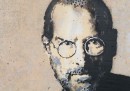 C'è Steve Jobs con in mano un vecchio computer Apple e una sacca, è stato disegnato su un muro del campo profughi in Francia