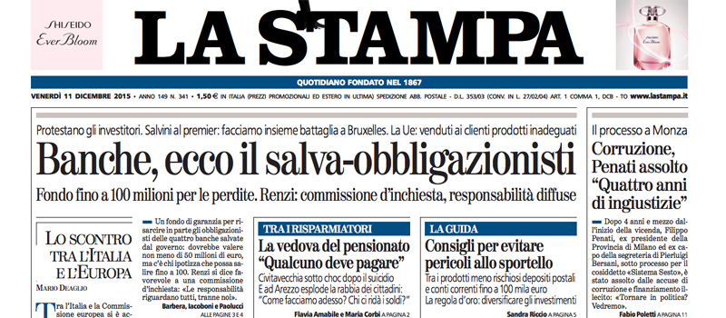 L’apertura di tutti i giornali è dedicata alla vicenda delle quattro banche salvate con un decreto dal governo: le notizie di oggi sono le critiche del commissario europeo Hill ai prodotti venduti dalle banche ai propri clienti, definiti “inadatti”, l’ipotesi di istituire un fondo di solidarietà per risarcire almeno parzialmente le perdite degli obbligazionisti dei quattro istituti, e le indagini della magistratura sul suicidio del pensionato di Civitavecchia.