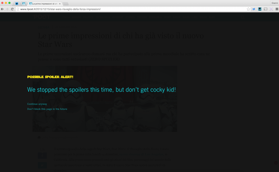 Force Block copre con una schermata nera tutta la pagina che contiene le parole Star Wars: in trasparenza si riesce a intuire qualcosa del testo, ma non abbastanza per leggerlo agilmente e distrattamente. Una volta controllata la pagina si può decidere di procedere normalmente e far scomparire la schermatura o di inserire il sito che si sta usando in una lista di “siti sicuri” (al Post, per esempio, gli spoiler li segnaliamo sempre molto in grande: qui non correte rischi).