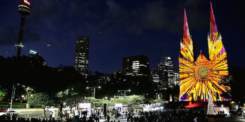 Da qualche anno a Sydney, in Australia, in occasione del Natale vengono montate alcune notevoli installazioni luminose in diverse parti della città. Uno degli spettacoli più notevoli è quello della cattedrale di Saint Mary, sulla cui facciata vengono proiettate immagini di diverso tipo (fiori, disegni geometrici, immagini sacre) con l’accompagnamento di musiche ed effetti sonori. La cattedrale di Saint Mary, costruita nel 1821 in stile gotico, è famosa per essere stata la prima chiesa cattolica in Australia.