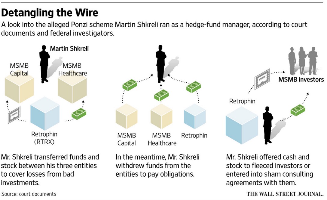 Le cose per MSMB non andavano bene da diversi anni, almeno dal 2009, ma Shkreli mentì a un investitore dicendogli di avere oltre 35 milioni di dollari nel fondo, convincendolo a investire circa un milione di dollari, e garanzie da parte di società esterne di revisioni dei conti. Non era vero: Shkreli aveva perso almeno 700mila dollari e a fine novembre 2010, il valore complessivo di MSMB era intorno ai 700 dollari. Negli anni seguenti, secondo l’accusa, Shkreli continuò a mentire ai suoi clienti organizzando operazioni finanziarie e di disinformazione di vario tipo per confondere le acque, facendo credere ai pochi investitori realmente esistenti che gli affari stessero andando bene.