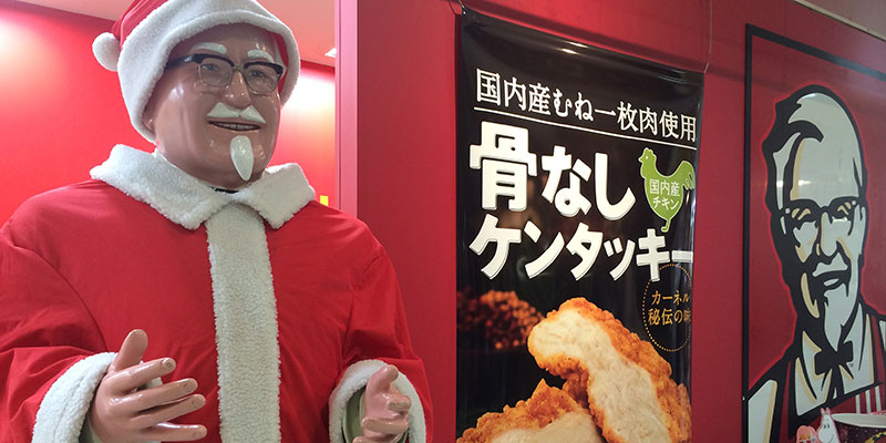 Il Natale non è festa nazionale in Giappone e si stima che i cristiani giapponesi siano circa l’uno per cento della popolazione. Nonostante questo, quasi tutti i giapponesi festeggiano il Natale e molti di loro lo fanno mangiando pollo fritto, per la precisione il pollo fritto venduto dalla catena di fast food Kentucky Fried Chicken (la catena statunitense nota come KFC). La vigilia di Natale – e in misura minore il 23 e il 25 dicembre – i KFC del Giappone sono pieni, al punto che è difficile che chi non ha prenotato un tavolo possa trovare posto.