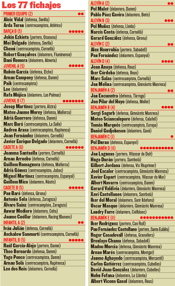 Il quotidiano sportivo catalano El Mundo Deportivo ha messo insieme i nomi e le categorie in cui andranno a giocare ciascuno dei 77 nuovi giocatori, fra i quali ci sono alcuni dei giovani spagnoli più promettenti in circolazione. Fra due giorni il Barcellona potrà completare anche il trasferimento del sudcoreano Seungwoo Lee, che fu uno degli ingaggi irregolari sanzionati dalla FIFA un anno fa.