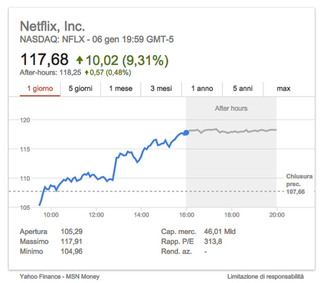 Netflix esiste dal 1998. All’inizio offriva un servizio di noleggio di DVD e videogiochi che aveva superato nettamente la concorrenza di Blockbuster: dava la possibilità ai suoi utenti di sottoscrivere degli abbonamenti flat, di noleggiare film online e riceverli a casa per posta, senza limiti di tempo per la restituzione, al prezzo mensile di 8,99 dollari. Dal 2008 è stato attivato il servizio di streaming online on demand, accessibile tramite un apposito abbonamento. Netflix è quotata in borsa dal maggio 2002, quando vendette 5,5 milioni di azioni, al prezzo di 15 dollari l’una. Le azioni di Netflix sono andate benissimo durante tutto il 2015 e Quartz aveva definito “stellare” l’anno di Netflix. Il 6 gennaio le azioni di Netflix hanno guadagnato il 9 per cento: valevano 105 dollari l’una a inizio giornata, hanno chiuso a quasi 118 dollari (un anno fa le azioni di Netflix valevano meno di 50 dollari l’una).