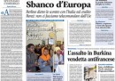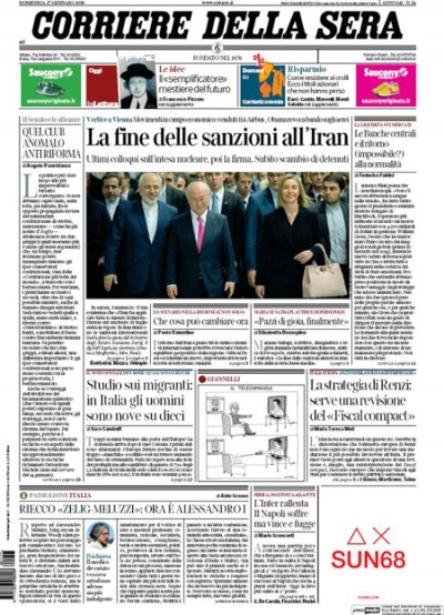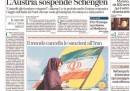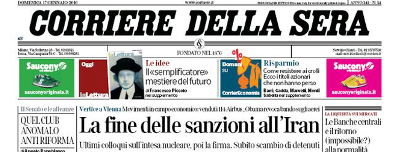 La notizia principale sulle prime pagine dei giornali di oggi è la fine delle sanzioni economiche e finanziarie imposte all’Iran negli ultimi nove anni a causa del suo contestato programma nucleare. Diversi giornali parlano anche dei piani del governo per combattere il fenomeno dell’assenteismo tra i dipendenti pubblici, mentre altri dedicano spazio alla sospensione da parte dell’Austria del trattato di Schengen. I giornali sportivi aprono invece perlopiù sulla vittoria del Napoli contro il Sassuolo nella prima giornata del girone di ritorno della Serie A.