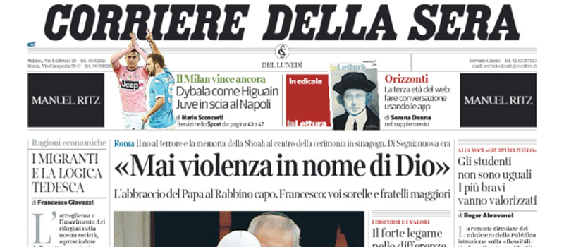 La visita del Papa in sinagoga, la morte del bambino italiano in Burkina Faso, e la Juventus insegue il Napoli
