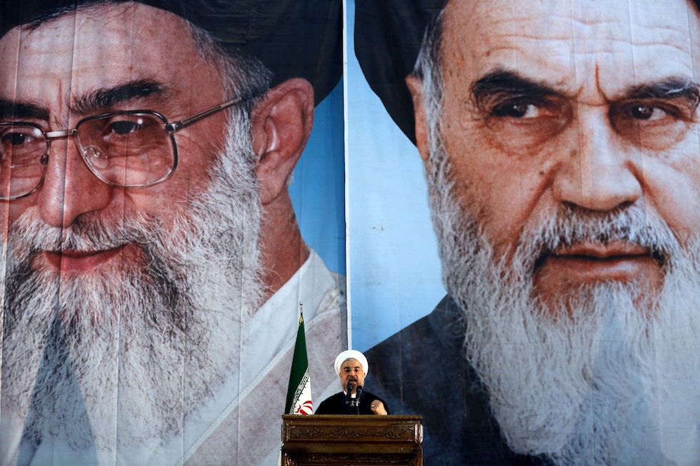 Il presidente iraniano Hassan Rouhani con dietro le facce dell’attuale Guida Suprema Ali Khamenei, a sinistra, e del fondatore della Repubblica Islamica dell’Iran Ruhollah Khomeini, a destra (ATTA KENARE/AFP/Getty Images)