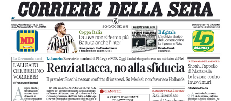 Sono due le notizie principali in apertura sui giornali di oggi: il voto con cui il Senato ha bocciato le mozioni di sfiducia nei confronti del Presidente del Consiglio Renzi e del ministro Boschi per la vicenda delle banche, e la ricerca delle responsabilità per la copertura delle statue in Campidoglio durante la visita del Presidente iraniano Rouhani. Fanno scelte diverse la Stampa, che apre sull’accordo che sarebbe stato firmato da una società italiana con l’Iran per la fornitura di 20 ATR e che violerebbe le sanzioni americane, e Repubblica, che titola sul contenzioso fra il fisco italiano e Google, mentre i quotidiani sportivi si occupano della netta vittoria della Juventus sull’Inter nell’andata delle semifinali di coppa Italia.