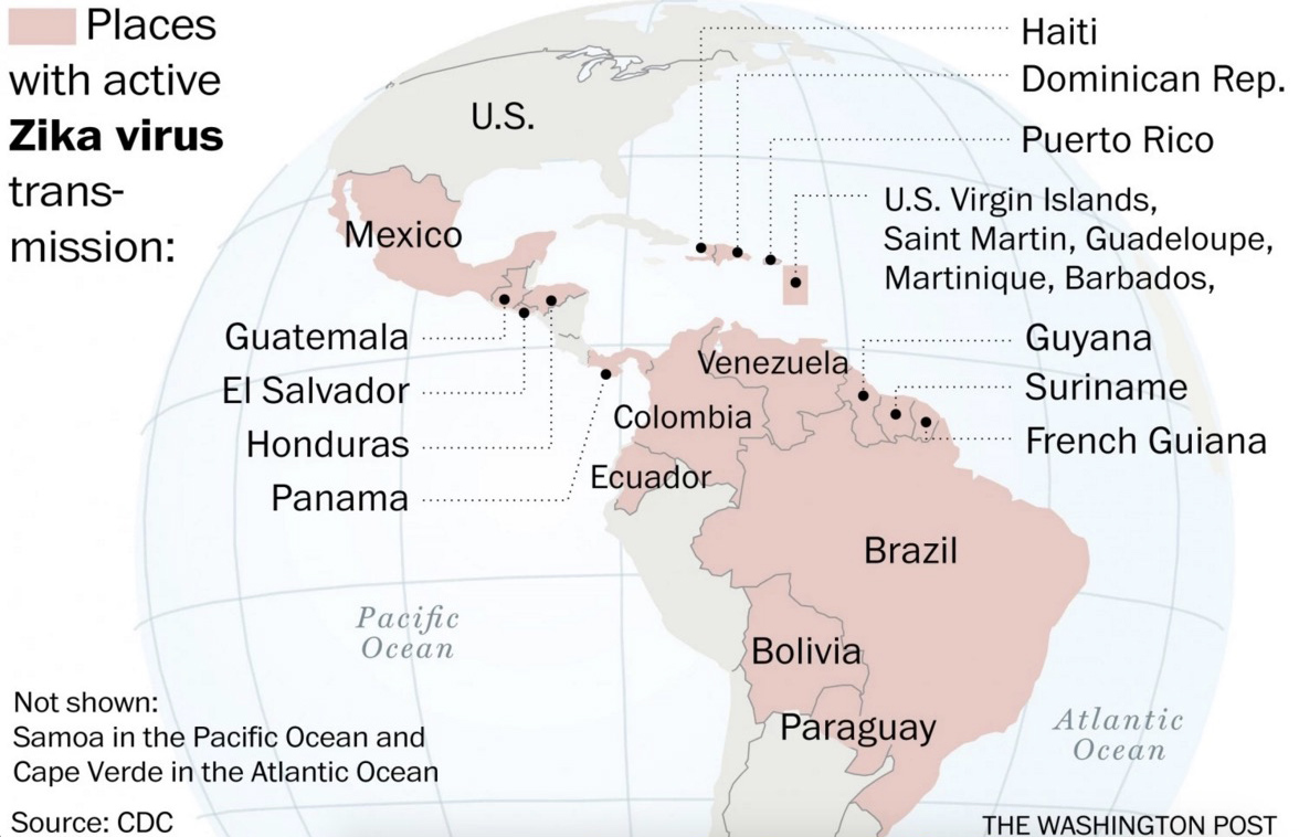 Il più alto numero di contagi da virus Zika è stato rilevato nell’ultimo anno in Brasile: l’OMS stima che le persone infettate siano state tra le 500mila e gli 1,5 milioni. Sempre in Brasile è stato registrato un aumento considerevole dei casi di microcefalia: da poche centinaia negli anni precedenti, si è passati a quasi 3500 casi segnalati, con almeno 270 già confermati dal ministero della Salute. Al momento non ci sono prove definitive circa il ruolo del virus nelle malformazioni. Secondo alcuni osservatori, il Brasile finora non ha mostrato di avere le capacità necessarie per arginare il numero di contagi, che intanto si sono estesi ad altri paesi del Sud e del Centro America, con una trentina di casi rilevati anche negli Stati Uniti questa settimana.