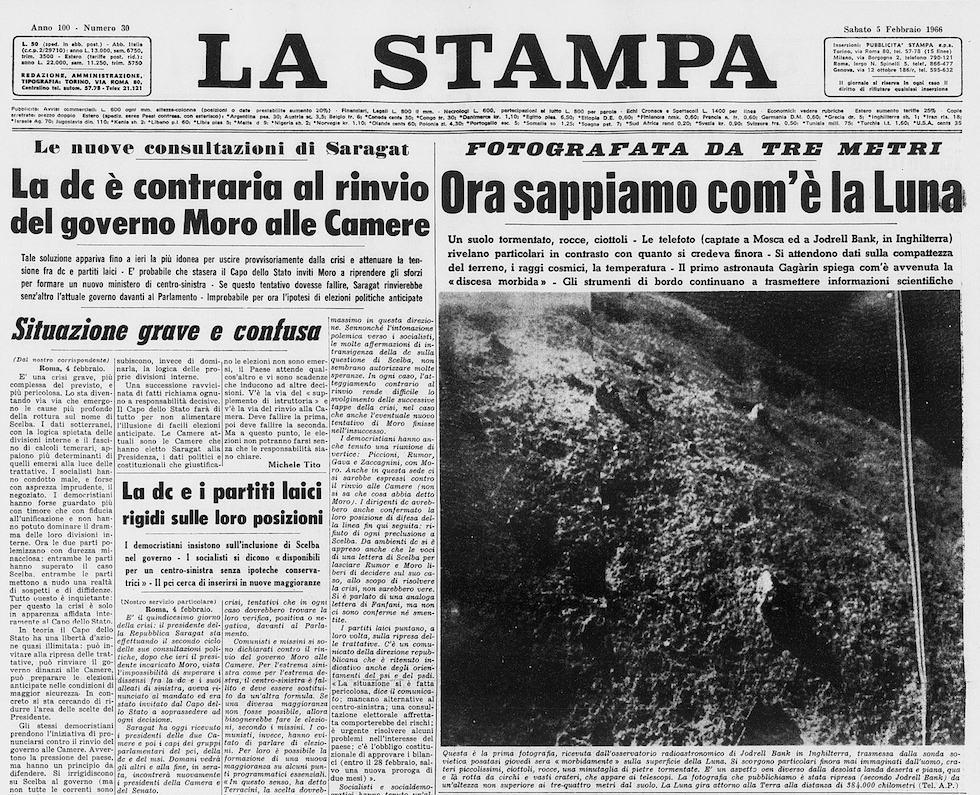 L’Unione Sovietica non rese subito pubbliche le immagini, ma queste finirono lo stesso sui giornali grazie ai ricercatori dell’osservatorio Jodrell Bank dell’Università di Manchester, Regno Unito, che con il loro radiotelescopio avevano tenuto sotto controllo le trasmissioni di Luna 9. Analizzandole, si accorsero che per trasmettere le immagini a Terra il lander utilizzava il formato Radiofax, lo stesso usato dalle agenzie di stampa per trasmettere le loro immagini ai giornali. Il quotidiano Daily Express fornì all’osservatorio la strumentazione rendendo possibile la ricezione delle immagini di Luna 9 senza doverle attendere dall’Unione Sovietica. Rispetto alle immagini che riceviamo ora da sonde in alcuni casi a centinaia di milioni di chilometri da noi, erano sgranate e poco definite, ma erano il frutto di un grande progresso tecnologico e mostravano comunque da vicino un mondo che ci accompagna da sempre, eppure all’epoca ancora poco conosciuto.