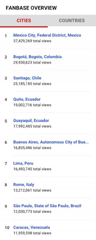 YouTube ha introdotto lo scorso giugno un nuovo servizio, chiamato Music Insights, che permette a tutti gli utenti di vedere una classifica delle città dove vive la maggioranza delle persone che ascoltano un certo musicista, in base alle visualizzazioni dei video delle canzoni. Oggi questi dati sono disponibili per i diecimila artisti più popolari su YouTube, ma presto ne verranno aggiunti molti altri. Andando a spulciare fra le pagine degli artisti più famosi si scoprono cose non scontate: nelle immagine qui sotto ci sono le classifiche per Laura Pausini delle città e dei paesi dove vengono visualizzati di più i suoi video, la prima città italiana è Roma all’ottavo posto. I dati partono dal 2014 e ovviamente non tengono conto di chi ascolta Pausini solamente da cd o tramite altre piattaforme di musica in streaming.