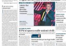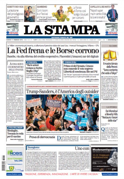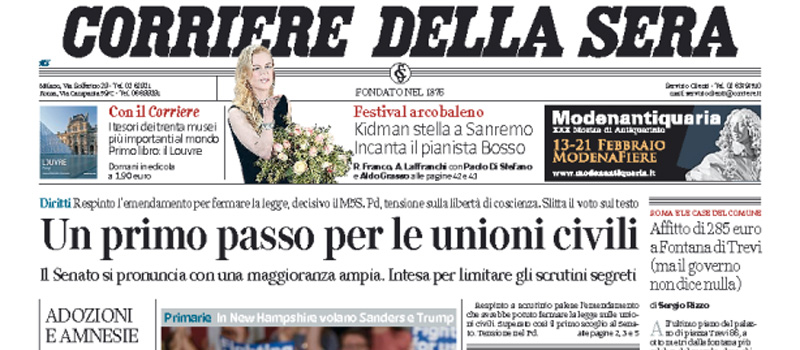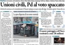 Le notizie in apertura sui quotidiani di oggi sono diverse: molti si occupano del primo voto sulla legge per le unioni civili al Senato, che ha respinto la richiesta di non passare a votare il provvedimento, altri titolano sul decreto di riforma delle banche approvato ieri sera dal Consiglio dei Ministri, mentre la Stampa apre sulla decisione della FED di rinviare il rialzo dei tassi USA e sulla reazione positiva delle borse, e il Manifesto segue la vittoria di Sanders nelle primarie democratiche in New Hampshire.