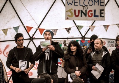 Jude Law ha recitato alcuni testi teatrali tradotti in simultanea in diverse lingue davanti ad almeno 200 migranti, allo scopo di sensibilizzare l’opinione pubblica soprattutto sui minorenni non accompagnati che arrivano in Europa. Poi ha letto una lettera aperta firmata da lui e da un centinaio di altre personalità britanniche (gli attori Benedict Cumberbatch, Gillian Anderson, Colin Firth, Helena Bonham Carter e Idris Elba, tra gli altri) rivolta al premier David Cameron, per chiedergli di accogliere immediatamente i minori che, pur avendo dei familiari nel Regno Unito, si trovano bloccati nel campo di Calais. La lettura è stata organizzata da Lives Letters, associazione che organizza eventi in cui fa recitare ad attori e comici lettere di famosi personaggi, e dall’associazione umanitaria Help Refugees. Jude Law ha detto: «È nostra responsabilità come esseri umani occuparci dei nostri bambini. I minori del campo di Calais hanno bisogno di noi. Non è una grande richiesta, è semplicemente la cosa giusta da fare».
