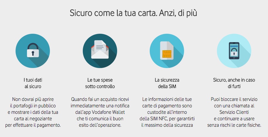 Vodafone ha annunciato Vodafone Pay, un nuovo servizio per usare il proprio smartphone come una carta di credito quando si fanno gli acquisti nei negozi e nei supermercati. Il sistema è compatibile con le carte MasterCard e Visa e funziona attraverso l’applicazione Vodafone Wallet disponibile per smartphone Android (qui la lista dei modelli compatibili). Per utilizzarlo è sufficiente aprire l’app, fotografare la propria carta di credito e aggiungerla al sistema. Le informazioni sulle carte vengono registrate all’interno della SIM NFC di Vodafone, isolati dal resto, in modo che non possano essere ottenute da altre persone. Il numero delle carte di credito non viene fisicamente salvato sul dispositivo, quindi se lo si perde si può bloccare la SIM NFC e continuare a utilizzare normalmente le carte vere e proprie.