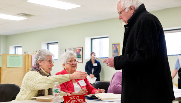 Bernie Sanders vota in un seggio di Burlington, in Vermont, nel giorno del Super Tuesday. (AP Photo/Jacquelyn Martin)