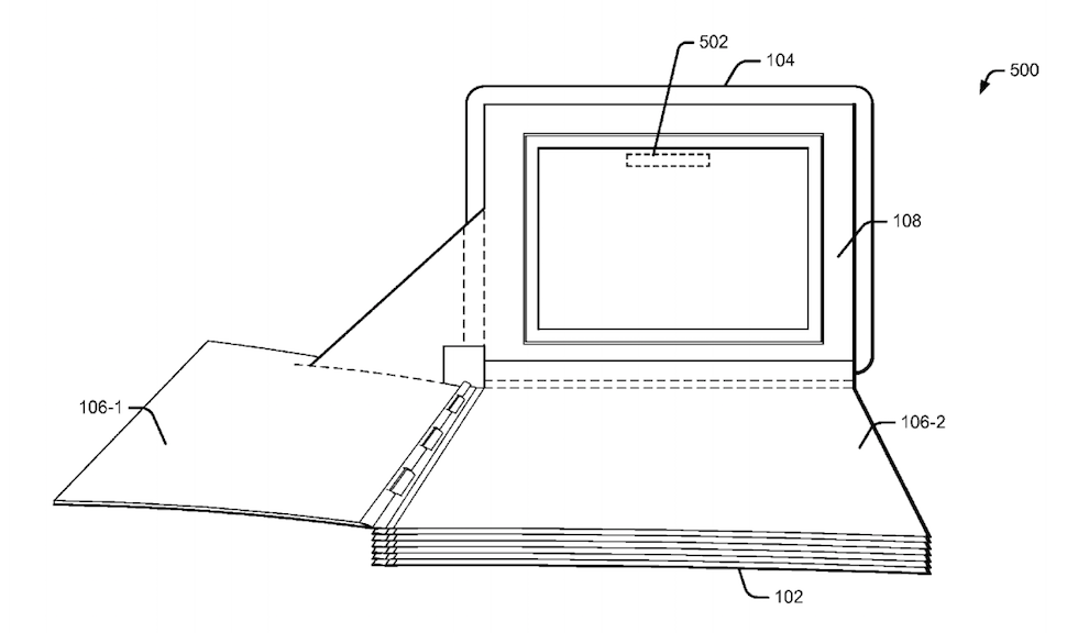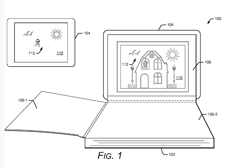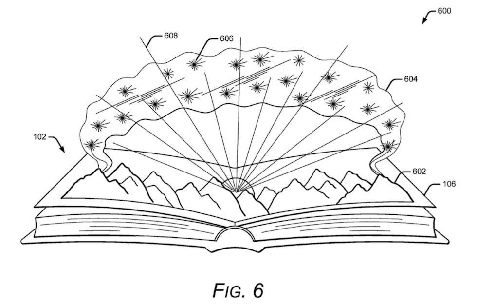 Il brevetto mostra come, ad esempio, la cornice di una casa descritta nel libro e ritagliata su una pagina verticale possa essere popolata da personaggi e oggetti che appaiono sullo schermo del dispositivo.