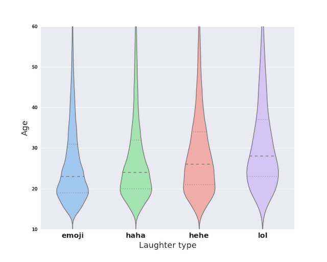 Graber cita uno studio fatto nell’estate 2015 da Facebook: aveva lo scopo di studiare il modo in cui la gente rideva (o diceva di ridere) online e spiegava che circa il 15 per cento degli utenti statunitensi di Facebook avevano fatto ricorso a una risata digitale nei sette giorni presi in esame. Più della metà delle risate (il 51 per cento del totale) erano degli “haha”, l’emoji che ride era al secondo posto (33,7 per cento dei casi) e nel 13,1 per cento dei casi erano stati usati degli “hehe”. Il LOL si era fermato a un valore percentuale di 1,9 e tra i quattro tipi di risata era quello meno usato dagli adolescenti.