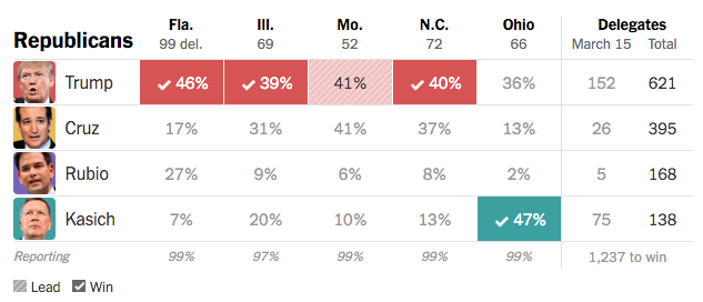 Trump infatti ha vinto in Florida, Illinois e North Carolina, ma in Ohio ha vinto il governatore moderato John Kasich, in un altro risultato significativo della serata: Kasich ha ottenuto nel suo stato la sua prima vittoria in queste primarie, evitando così che Trump potesse ottenere ancora più delegati e rendendo piuttosto impervia la sua strada per arrivare alla maggioranza assoluta. Sul fronte dei delegati, infatti, queste vittorie permettono a Trump di aumentare il suo distacco – anche perché da oggi i Repubblicani, tranne che in North Carolina, cominciavano ad assegnare i loro delegati col sistema maggioritario – ma non abbastanza da evitare del tutto lo scenario della “brokered convention” (che invece sembra l’unica o quasi possibilità di Ted Cruz e John Kasich a questo punto per ottenere la nomination). In Missouri lo scrutinio è quasi finito e Trump e Cruz sono praticamente pari: servirà ancora tempo per capire chi ha vinto.