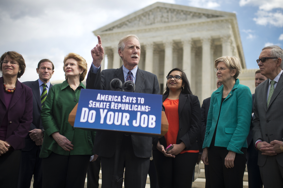 Alcuni senatori democratici tengono una conferenza stampa davanti alla Corte Suprema con un cartello “Do your job”, 17 marzo 2016 (Tom Williams/CQ Roll Call via AP Images)